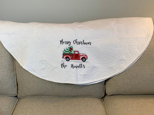 Personalized Christmas Tree Skirt: Red Truck Embroidery, Matelassé Design