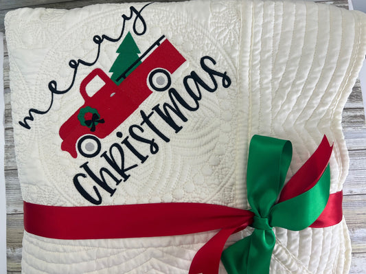 Embroidered Christmas Truck Quilt: Personalized Cotton Matelassé