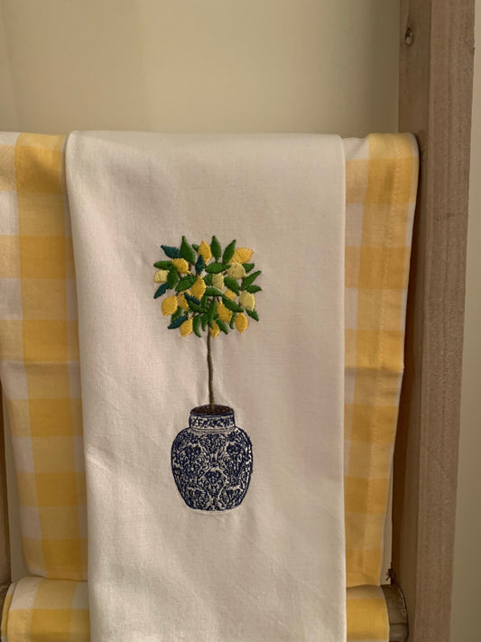 Embroidered Lemon Topiary Kitchen Towel: Chinoiserie Decor