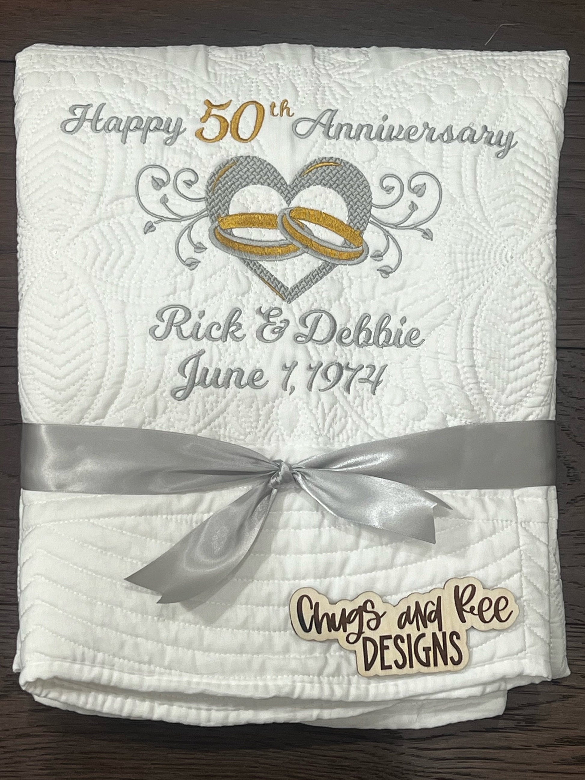 Personalized anniversary quilt-the perfect anniversary gift gift! Beautiful as a gift and it comes tied with a bow. It is 100% Cotton and comes in multiple sizes (select size when checking out). It has round quilted medallions in a Matelassé design. It is perfect for any room.