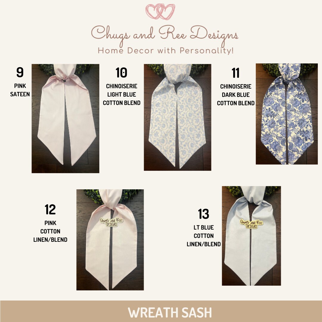 Wreath Sashes are just the right touch to add to your home decor! They are easy to tie at the top or bottom of a wreath. I have 2 fabric options; Cotton Sateen (sheen, soft and beautiful fabric) and Cotton/Linen Blend (thicker than the sateen, matte finish material) both in size 5" W 54"L.